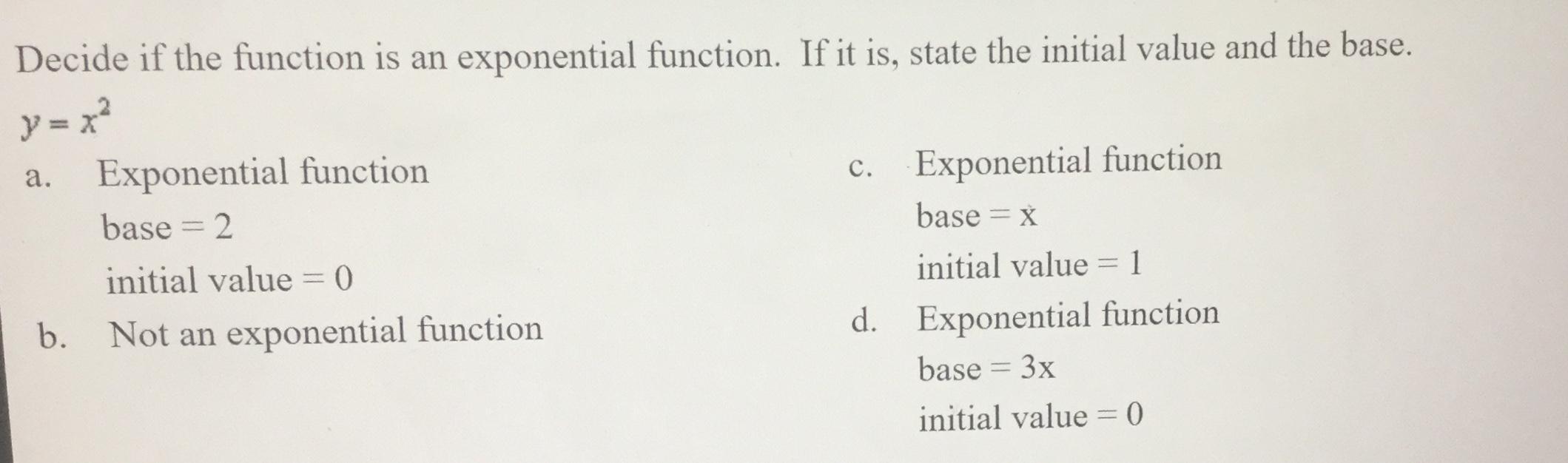 Decide if the function is an exponential function. If it is state the initial value and the base y=x^2