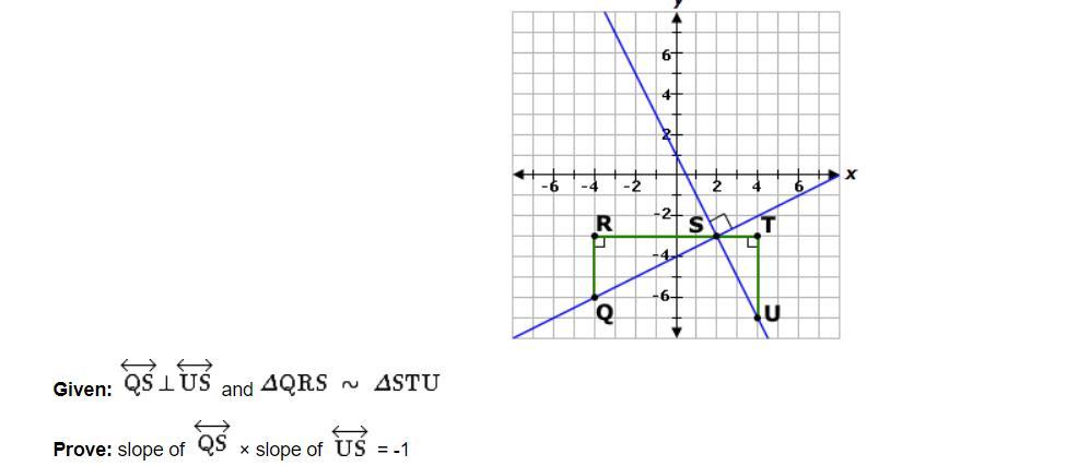 The given table shows the proof of the relationship between the slopes of two perpendicular lines.The missing statement in step 5 is given by option D. slope of QS x slope of US = -\frac{ST}{TU}*\frac{TU}{ST}