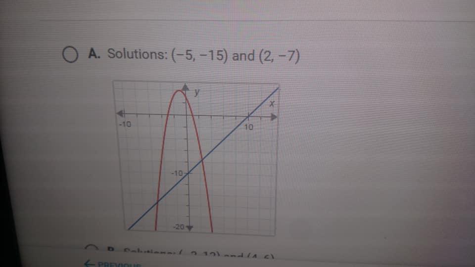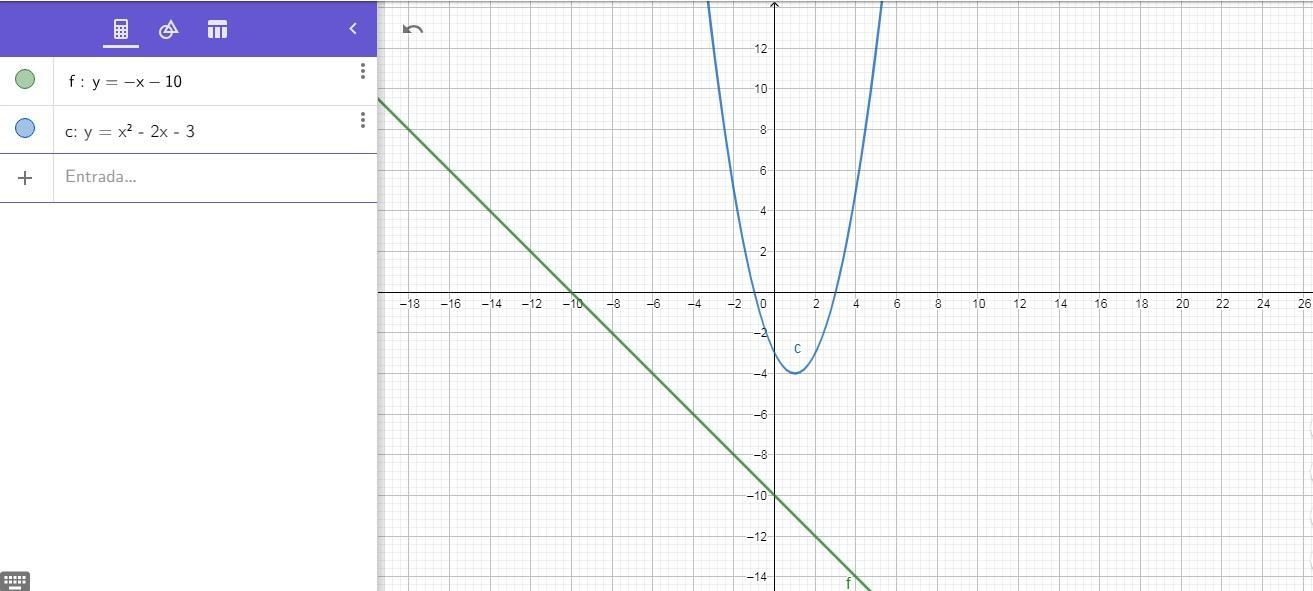 on a piece of paper, graph this system of equations. y = - x - 10 y = x^2 - 2x - 3 then determine which answer choice matches th