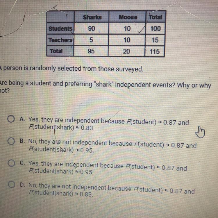 No, they are not independent because P(student)= 0.87 and P(student/shark)=0.95