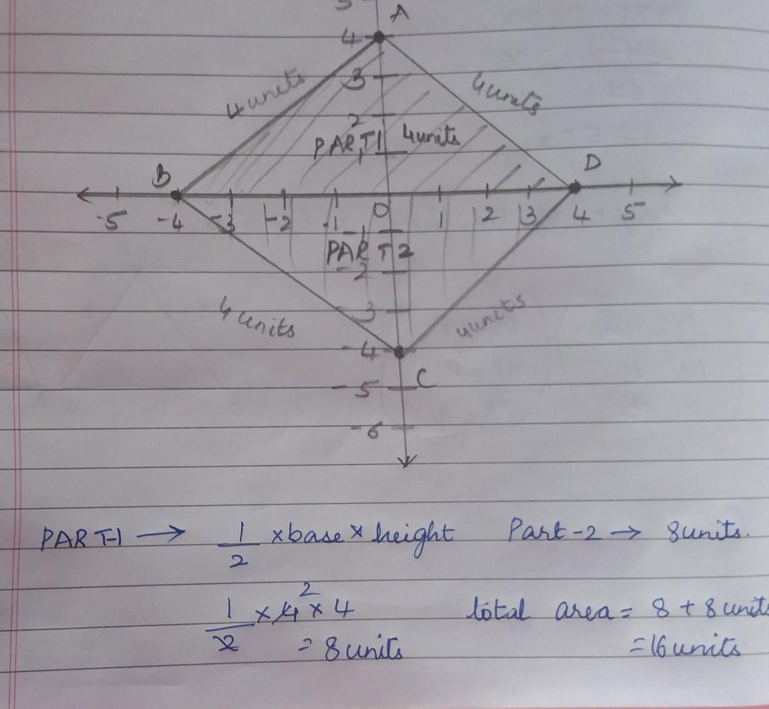 Square KITE has vertices (-4, 0), (0, 4), (4, 0), and (0, -4), respectively. Name the square's diagonals and find their point of