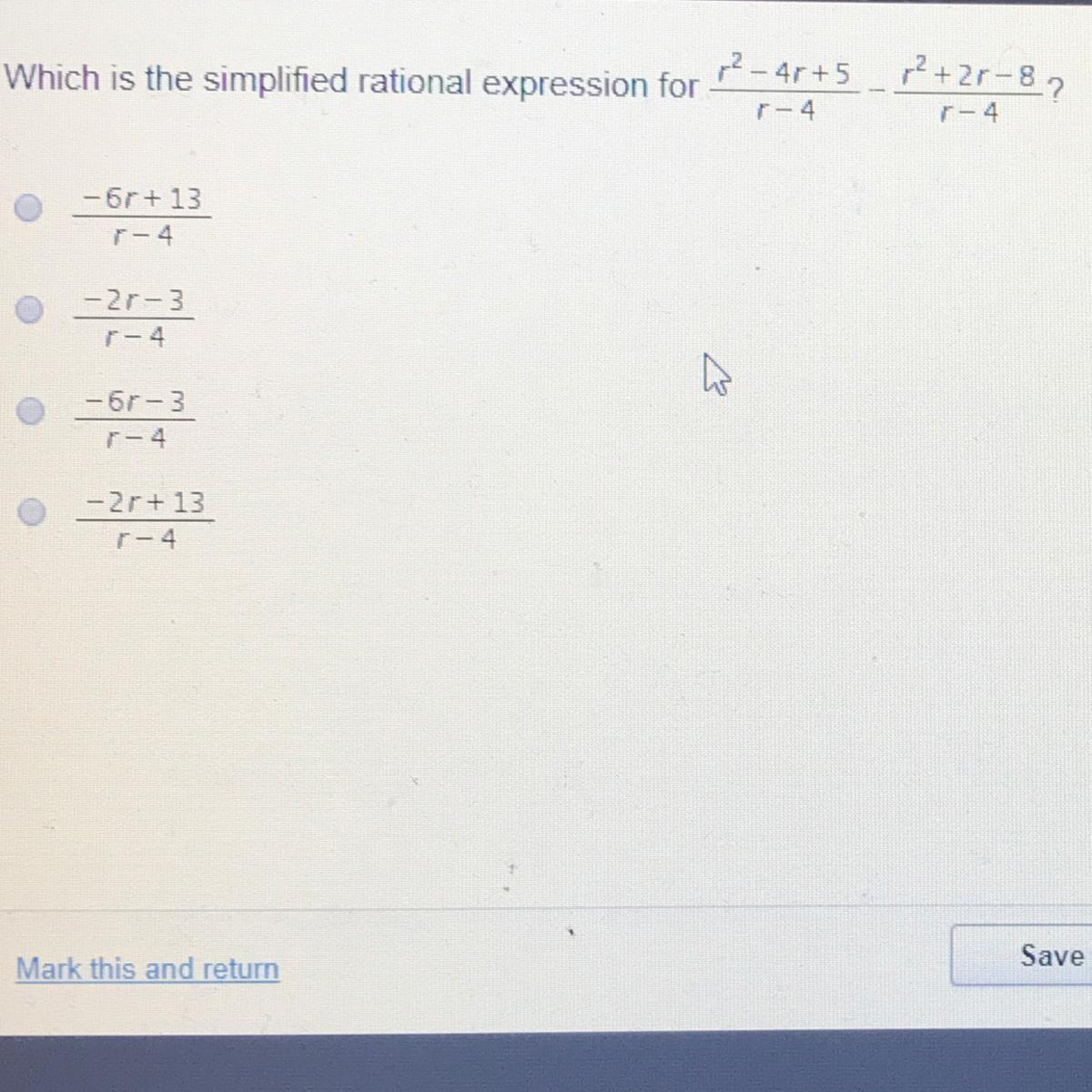 \frac{ {r}^{2}  - 4r + 5}{r - 4}  -  \frac{ {r}^{2}  + 2r - 8}{r - 4}  \\  =  \frac{ ({r}^{2} - 4r + 5) - ( {r}^{2}  + 2r - 8) }{r + 4}  \\  =   \frac{ {r}^{2} -  {r}^{2}  - 4r - 2r + 5 - 8 }{r - 4}  \\  =   \frac{ - 6r - 3}{r - 4}