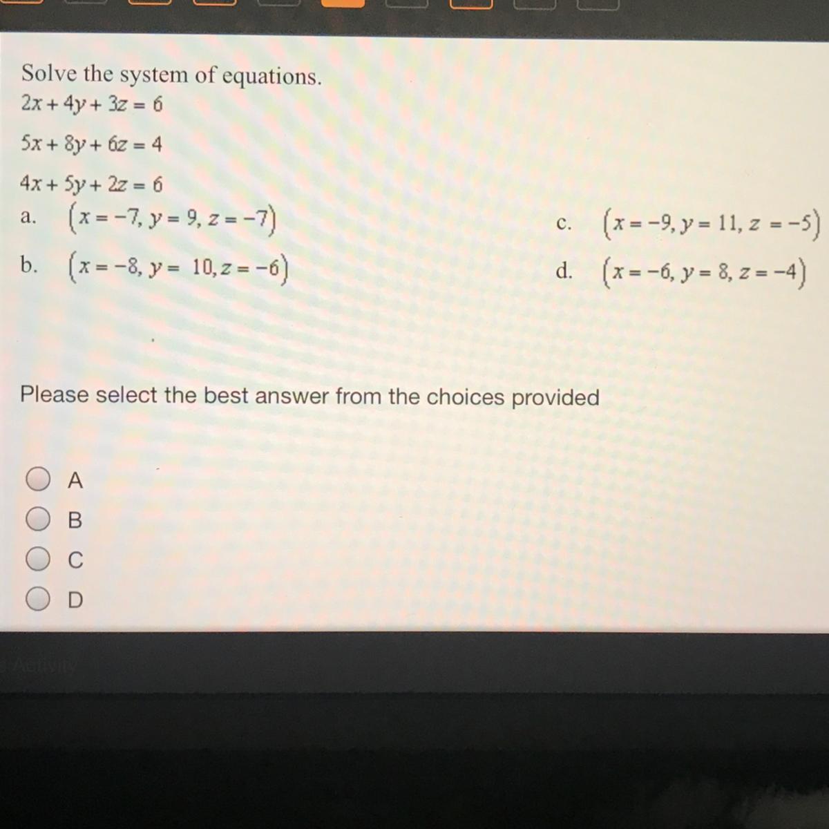 In case you don't have answers to select from, you generally solve this sort of problem using elimination. You can also use Cramer's rule, a graphing calculator, an on-line equation solving tool, or any of a variety of other methods.