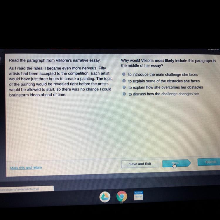 In this case, Viktoria is writing a narrative essay, meaning that she is trying to prove her hypothesis by narrating a story. As this part is in the middle, it means that it is not very important but it may give additional information to help readers understand better what the speaker wants to say. She mentions the given situation and how she wasn't able to brainstorm, which can be inferred as an obstacle. She also explains why it happens and how she felt about it.