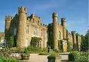 The majestic castle, surrounded by green foliage, stood proudly with turrets pointing skyward. Which image best shows a visualiz