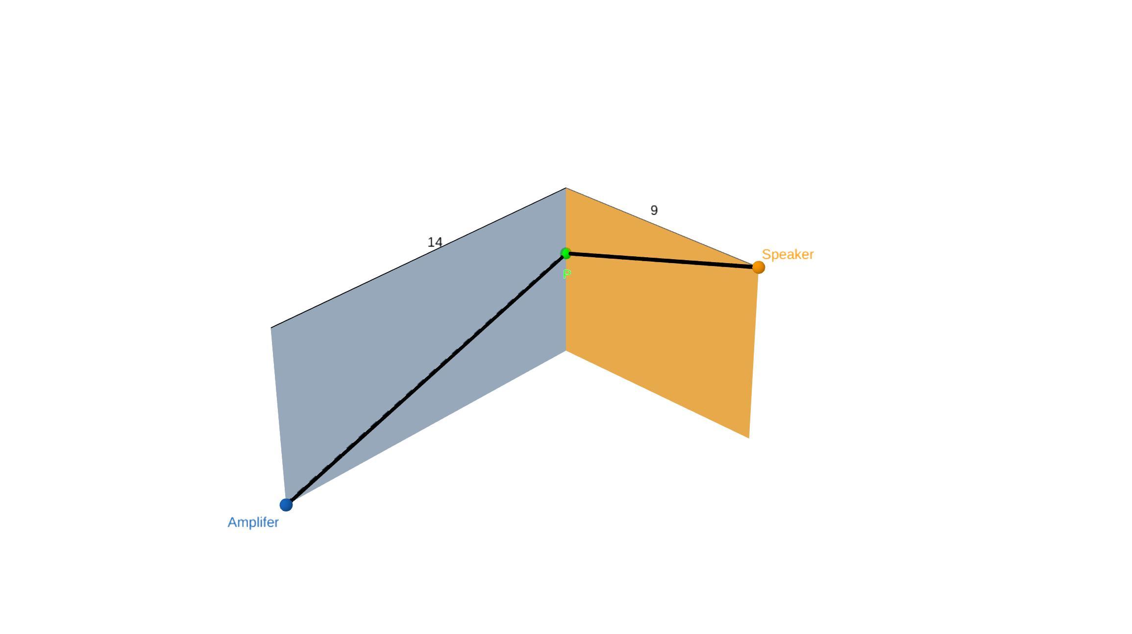 The wire between the speaker and the amplifier shall be routed along the wall. The length of the connection depends on the height of the point P at which the wire turns. Point P is shown in green in both diagrams.