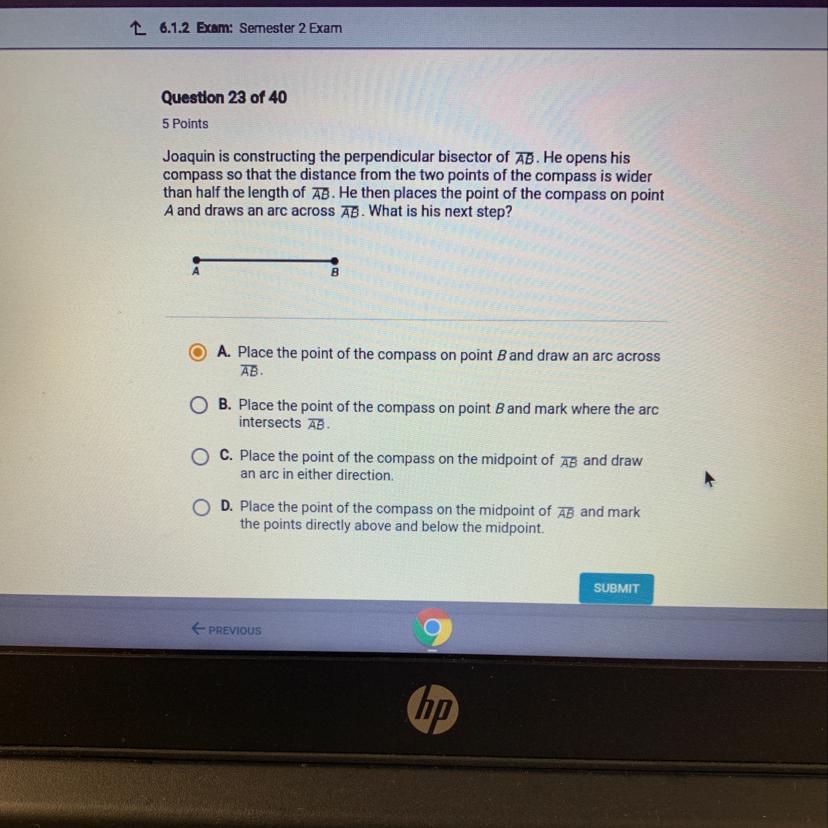Joaquin is constructing the perpendicular bisector of AB. He opens his