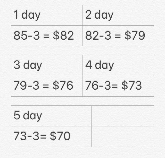 elow represents this situation. Latesha’s Lunch Account Day Amount Left in Account ($) 0 $85 1 2 3 4 5 How much is left in Latesha’s lunch account after she has had lunch for 5 days?