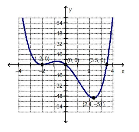 The graphed function shows a curve which has two turning points and three x-intercepts, which means it is a cubic polynomial. To check which statement is true, we will check all the statements one by one.