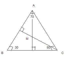 he heights of △ABC are drawn from vertices A and C. These heights intersect at point M. Find m∠AMC, if m∠A=70° and m∠C=80°.