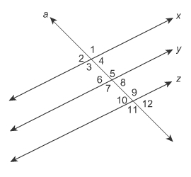 In the figure, x ‖ y ‖ z and a is a transversal that crosses the parallel lines.