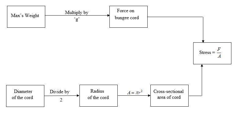 The stress developed in the bungee cord is the amount of tensile force developed inside the bungee cord due to the Max's weight.