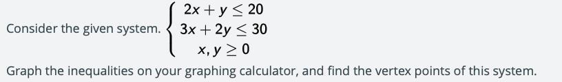 A. See below for a graph. The vertices are those defined by the second inequality, since it is completely enclosed by the first inequality: (0, 0), (0, 15), (10, 0)