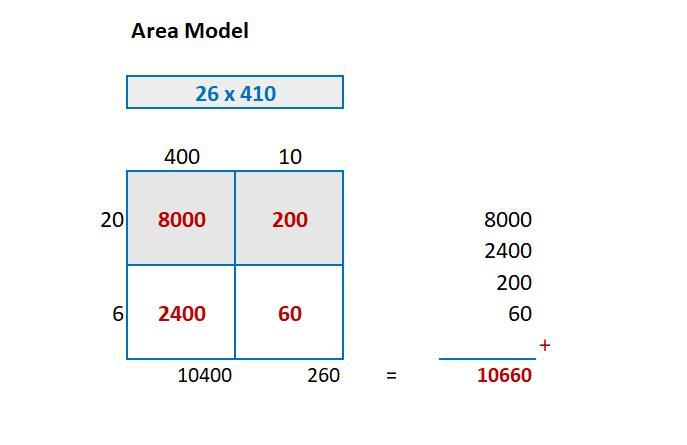 =\boxed {26 \times410)\ }\\=\boxed {(20+6) \times(400+10)\ }\\ =\boxed {(20 \times400)+(20 \times10)+(6 \times400)+(6 \times10)\ }\\ =\boxed {8000+200+2400+60\ }\\ =\boxed {10660\ }