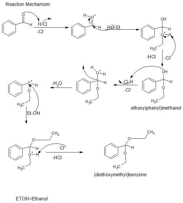 The reaction between benzaldehyde and dry ethanol is a example of nucleohilic addition reaction.
