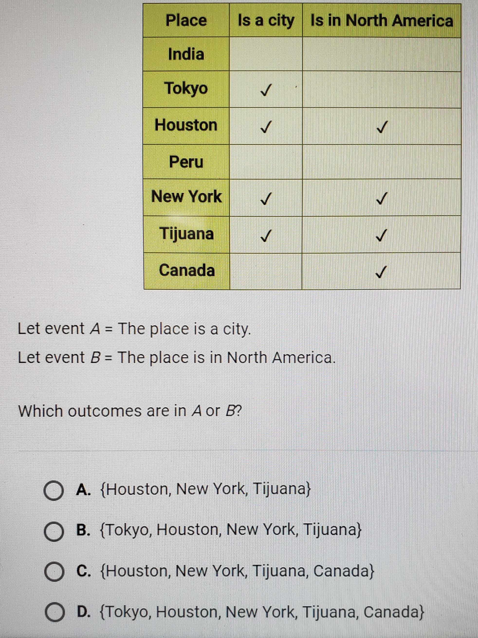 Let event A= the place is a city. Let event B=the place is in North America. which outcomes are in A or B