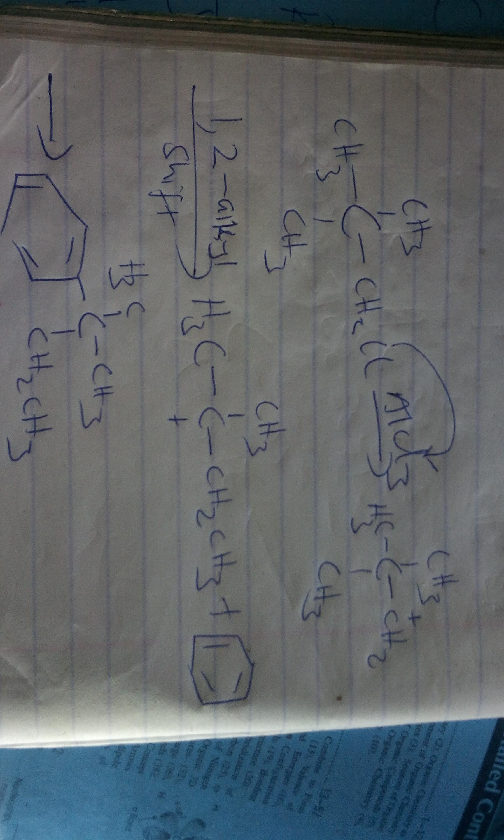 When the carbocation is formed by the action of AlCl3 on the (CH3)3CCH2Cl, a primary carbocation is formed. The formation of the carbonation is followed by a 1,2-alkyl shift to give a tertiary carbocation which subsequently adds to the benzene ring as shown in the image attached to this answer.