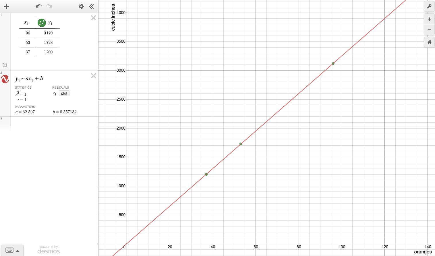 You can also plot the points on a graph and draw a line of best fit. It has a slope of about 32.5 cubic inches per orange.