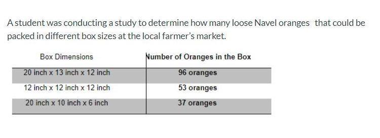 Roughly, the ratio of cubic inches to oranges is 32.5 cubic inches per orange.