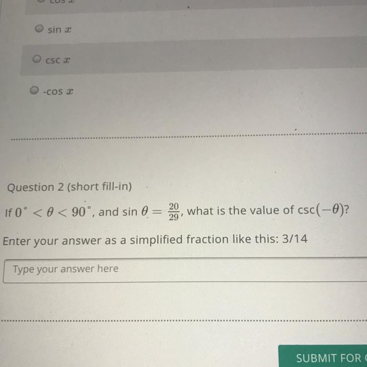 You take <em>sin</em><em>⁻</em><em>¹</em><em> </em>20⁄29 to get your <em>θ</em><em> </em>value of 0,7610127542, then plug this into the cosecant function to get this: