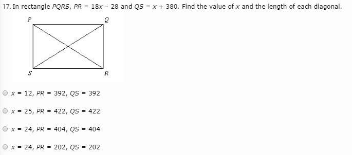 In rectangle PQRS, PR = 18x – 28 and QS = x + 380. Find the value of x and the length of each diagonal.