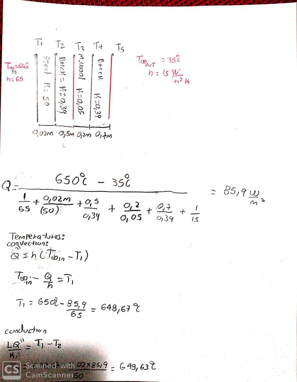 by mineral wool of 20 cm thickness (k = 0.05 W/mK) and 70 cm layer of brick of (k = 0.39 W/mK). The inside is exposed to convection at 650°C with h = 65 W/ m2K. The outside is exposed to air at 35°C with a convection coefficient of 15 W/m2K. Determine the heat loss per unit area, interface temperatures and temperature gradients in each materials.