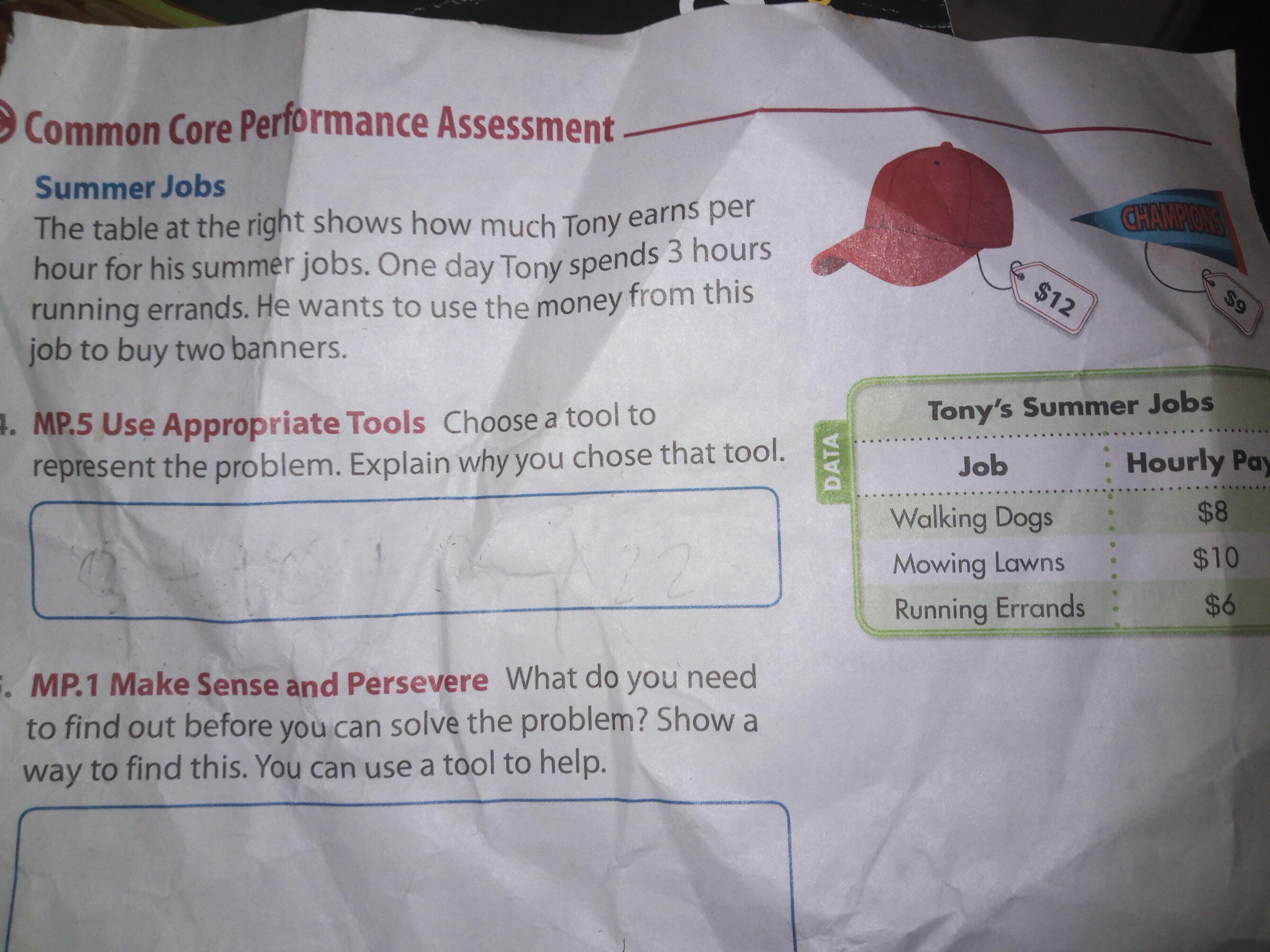 The table at the right shows how much tony earns per hour for his summer jobs one day tony spends 3 hours running errands he wants to use the money from his job to buy two banners.