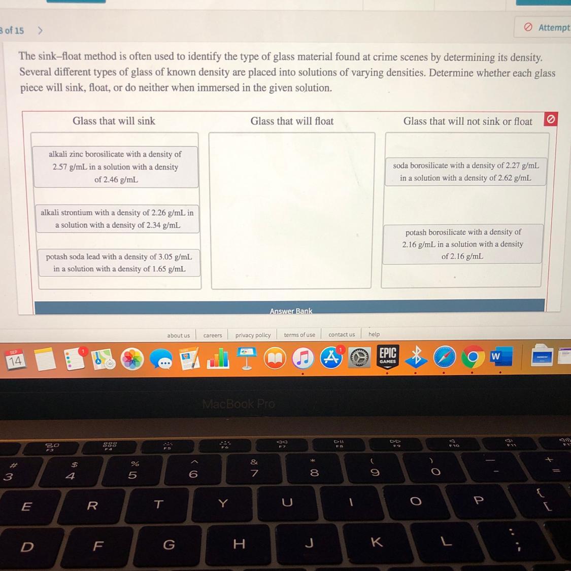 - alkali zinc borosilicate with a density of 2.57 g/mL in a solution with a density of 2.46 g/mL, because 2.57 > 2.46.