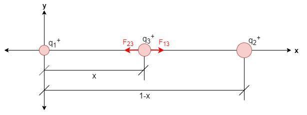 We assume a positive charge q₃ so F₁₃ and F₂₃ are repulsive forces and must be equal so that the net force is zero: