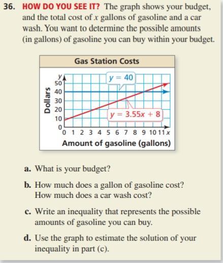 Part c) Write an inequality that represent the possible amounts of gasoline you can buy