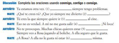 mpre me divierto (2) ? ANTOÑITO Tú eres la que siempre quiere ir (3) a la discoteca. MAITE Eso no es verdad. A mí no me gusta salir (4) . ¡Ni loca! ANTOÑITO No te preocupes. Muchas chicas quieren estar (5) . Siempre veo a Rosa en el Club 49. A ella seguro que le gusta. MAITE ¿A Rosa? A ella no le gusta ni estar (6) misma. ¡Es una falsa!