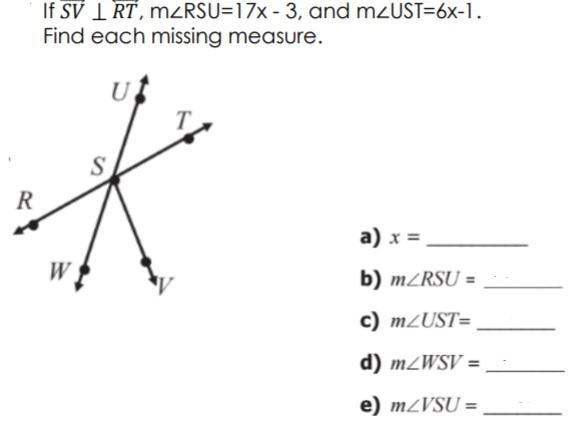 SV perpendicular RT RSU=(17x-3) and UST=(6x-1) find each measure