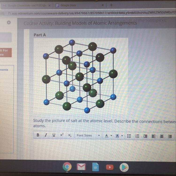 Study the picture of salt at the atomic level. Describe the connections between the sodium and chlorine atoms