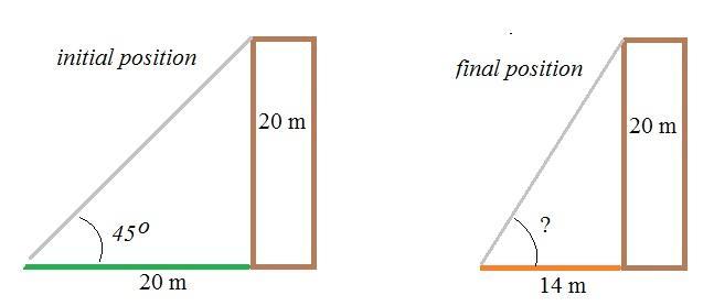 In the initial position, the angle of elevation of the 20 meter building to your feet is 45 degrees, that means that you are at 20 meters from the building (thus forming an isosceles triangle with with the building, with internal angles 456  degrees, 90 degrees, and 45 degrees.