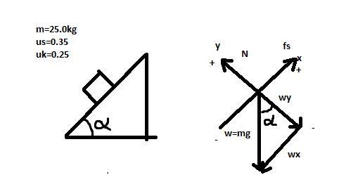 So, when we are talking about friction, there are two types of friction coefficients. Static and kinetic. Static friction happens when the box is not moving no matter what force you apply to it. You get to a certain force that is greater than the static friction and the box starts moving, it is then when the kinetic friction comes into play (kinetic friction is generally smaller than static friction). So in order to solve this problem, we must find an angle such that the static friction is the same as the force applie by gravity on the box. For it to be easier to analyze, we must incline the axis of coordinates, just as shown on the picture attached.