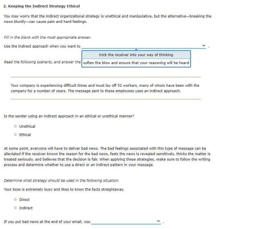 Ethical: it is ethical to reduce the emotional impact of a bad news by making use of an indirect approach which is less harsh and blunt unlike the direct approach. In situations such as communicating that a person has lost his job, it is important that the manager communicates using indirect approach