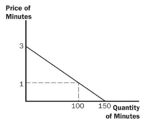 (d) The figure below shows the friend’s demand. With Provider A, she buys 150 minutes and her consumer surplus is equal to (1/2)(3)(150) – 120 = 105. With Provider B, her consumer surplus is equal to (1/2)(2)(100) = 100