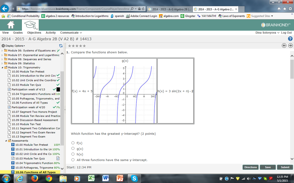 Looking at the two known equations and the graph i believe is referring to g(x) i believe that f(x)has the largest y intercept because g(x) looks like its at +2 and h(x) is at -2