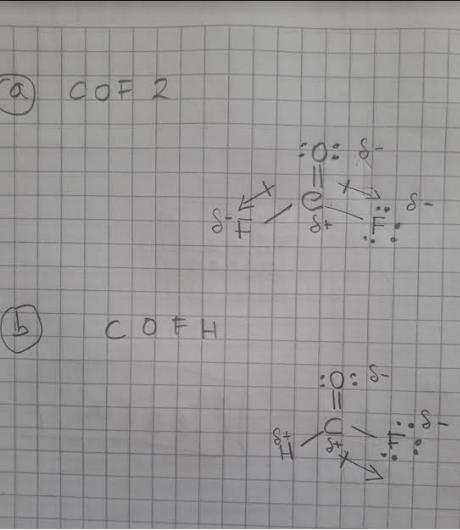 1. In the compound , there are two sets of bonds such as the C=O and C-F bonds. If we consider the electronegativities of the two bonds, the electronegativity of the C-F bond is slightly higher than that of the C=O. Thus, the negative pole exists in the middle of the two fluorine atoms Similarly, in the compound COFH, there are three sets of bonds which are C=O, C-H, and C-F. The negative pole exits in the middle of oxygen and fluorine.