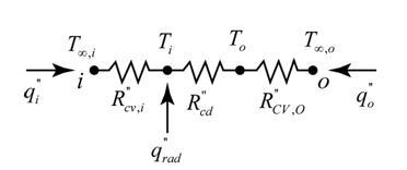 \frac {T_ \infty, i-T_{i}}{ R^{"}_{cv, i}} + \frac {T_{o}-T_{i}}{ R^{"}_{cd}} + q_{rad} = 0 Equation 1