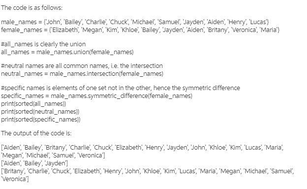 t creates: A set all_names that contains all of the top 10 male and all of the top 10 female names. A set neutral_names that contains only names found in both male_names and female_names. A set specific_names that contains only gender specific names. Sample output for all_names: {'Michael', 'Henry', 'Jayden', 'Bailey', 'Lucas', 'Chuck', 'Aiden', 'Khloe', 'Elizabeth', 'Maria', 'Veronica', 'Meghan', 'John', 'Samuel', 'Britney', 'Charlie', 'Kim'}
