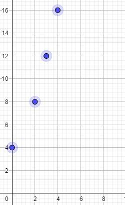 0 to 9. The y-axis is labeled from 0 to 17. Four points are shown on the graph on ordered pairs 0, 4 and 2, 8 and 3, 12 and 4, 16. These points are joined by a line. The label on the x-axis is Number of boats. The title on the y-axis is Number of passengers.