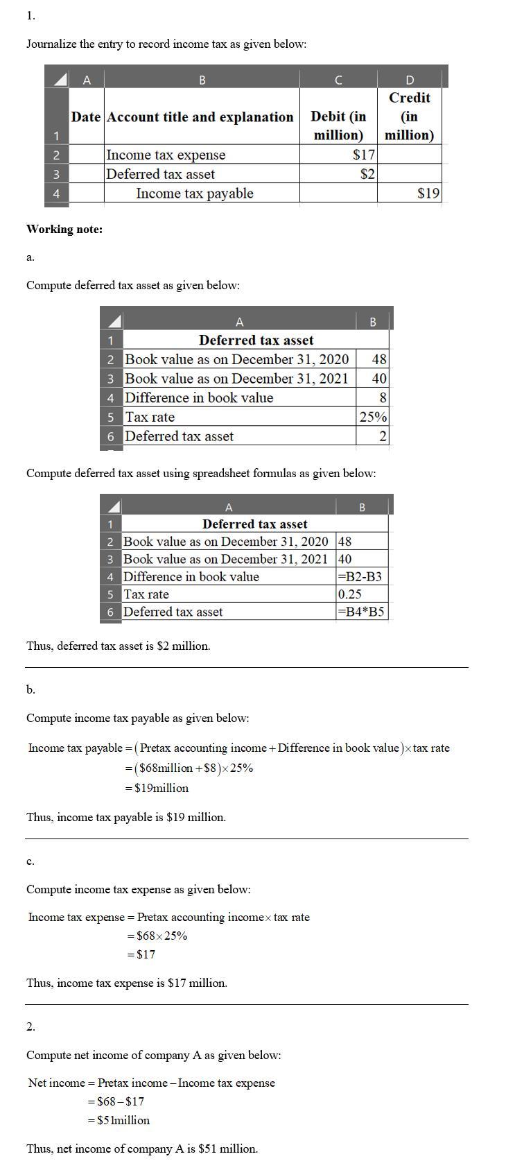 On January 1, 2018, Ameen Company purchased major pieces of manufacturing equipment for a total of $54 million. Ameen uses straight-line depreciation for financial statement reporting and deducted 100% of the equipment’s cost for income tax reporting in 2018. At December 31, 2020, the book value of the equipment was $48 million. At December 31, 2021, the book value of the equipment was $40 million. There were no other temporary differences and no permanent differences. Pretax accounting income for 2021 was $68 million. Required: 1. Prepare the appropriate journal entry to record Ameen’s 2021 income taxes. Assume an income tax rate of 25%. 2. What is Ameen’s 2021 net income?