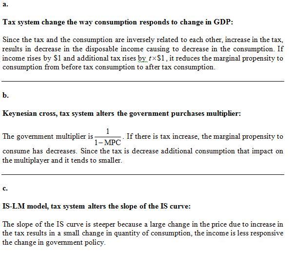 epend on income. Let’s represent the tax system by writing tax revenue as T = T + tY where T and t are parameters of the tax code. The parameter t is the marginal tax rate: if income rises by $1, taxes rise by t x $1.a. How does this tax system change the way consumption responds to changes in GDP?b. In the Keynesian cross, how does this tax system alter the government-purchase multiplier?c. In the IS-LM model, how does this tax system alter the slope of the IS curve?