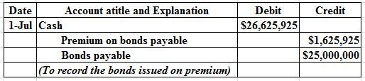 the cash received from the issuance of bond is debited with $26,625,925. The premium on bonds payable is credited with $1,625,925 and bonds payable is credited with $25,000,000.