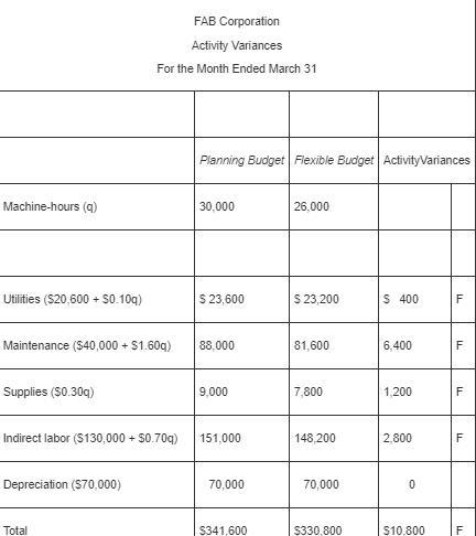 as asked that you review the company’s costing system and "do what you can to help us get better control of our manufacturing overhead costs." You find that the company has never used a flexible budget, and you suggest that preparing such a budget would be an excellent first step in overhead planning and control. After much effort and analysis, you determined the following cost formulas and gathered the following actual cost data for March: Cost Formula Actual Cost in March Utilities $20,600 plus $0.10 per machine-hour $ 24,200 Maintenance $40,000 plus $1.60 per machine-hour $ 78,100 Supplies $0.30 per machine-hour $ 8,400 Indirect labor $130,000 plus $0.70 per machine-hour $ 149,600 Depreciation $70,000 $ 71,500 During March, the company worked 26,000 machine-hours and produced 15,000 units. The company had originally planned to work 30,000 machine-hours during March. Required: 1. Prepare a flexible budget for March. 2. Prepare a report showing the spending variances for March.