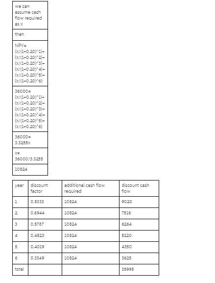 f $36,000. The life of this project is 6 years. Naomi's discount rate is 20%. By how much would the annual cash inflows from this project have to increase in order to have a positive net present value? Multiple Choice $1,200 or more $2,412 or more $6,000 or more $10,824 or more