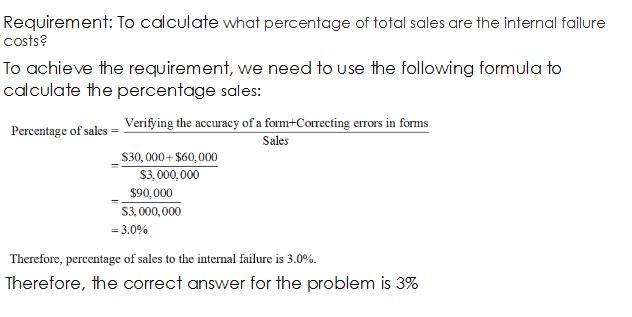 orm to reduce errors $15,000 Responding to customer complaints 75,000 Verifying the accuracy of a form 30,000 Correcting errors in forms 60,000 Total $180,000 If sales are $3,000,000, what percentage of total sales are the internal failure costs?