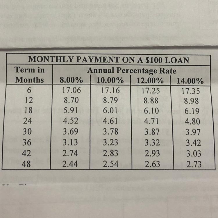 The figure contains a table with the monthly payment on a a $100 loan in function of the number of months (term in months) and the annual percent rates (8.00%, 10.00%, 12.00%, 14.00%).