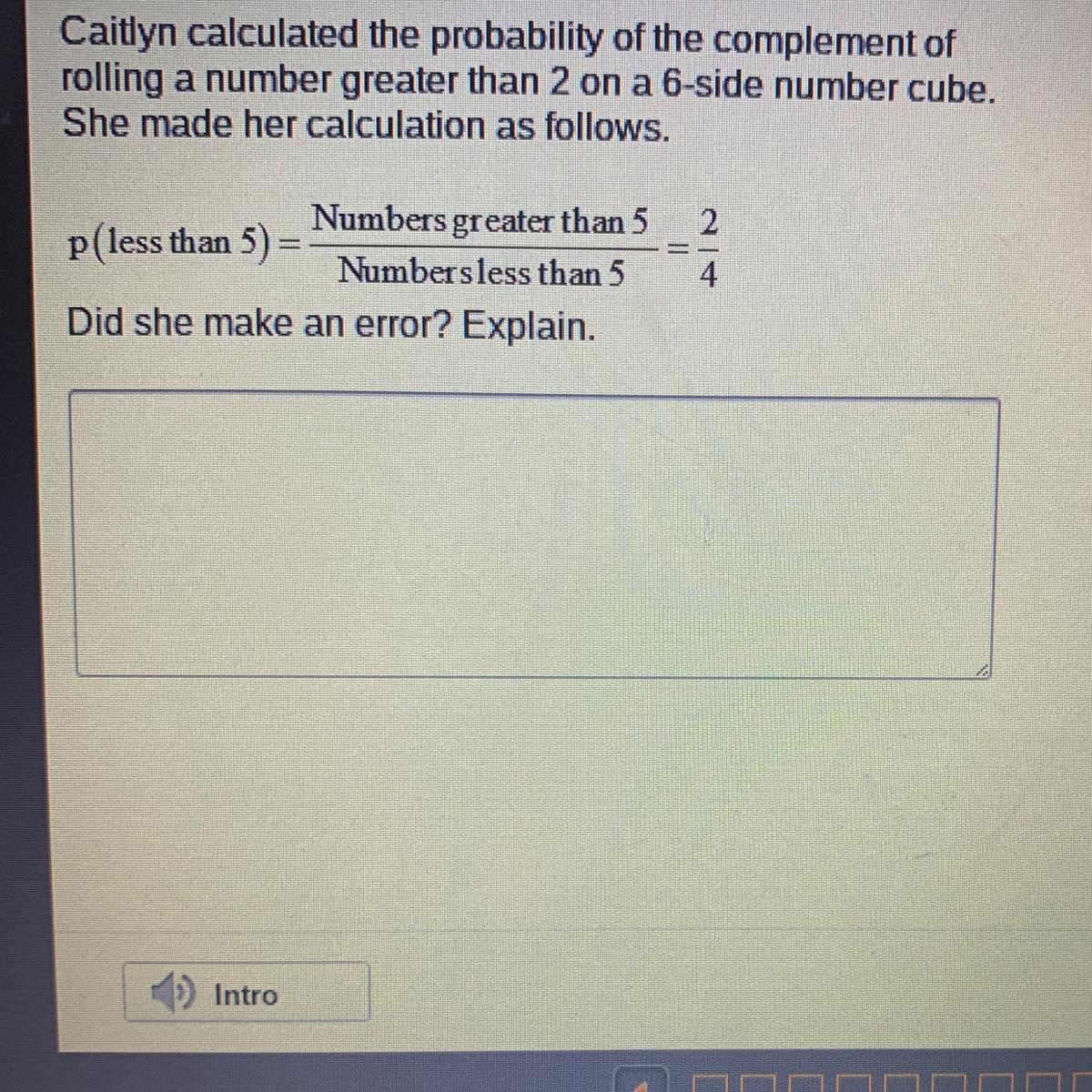 Caitlyn calculated the probability of the complement of rolling a number greater than 2 on a 6-side number cube. She made her ca